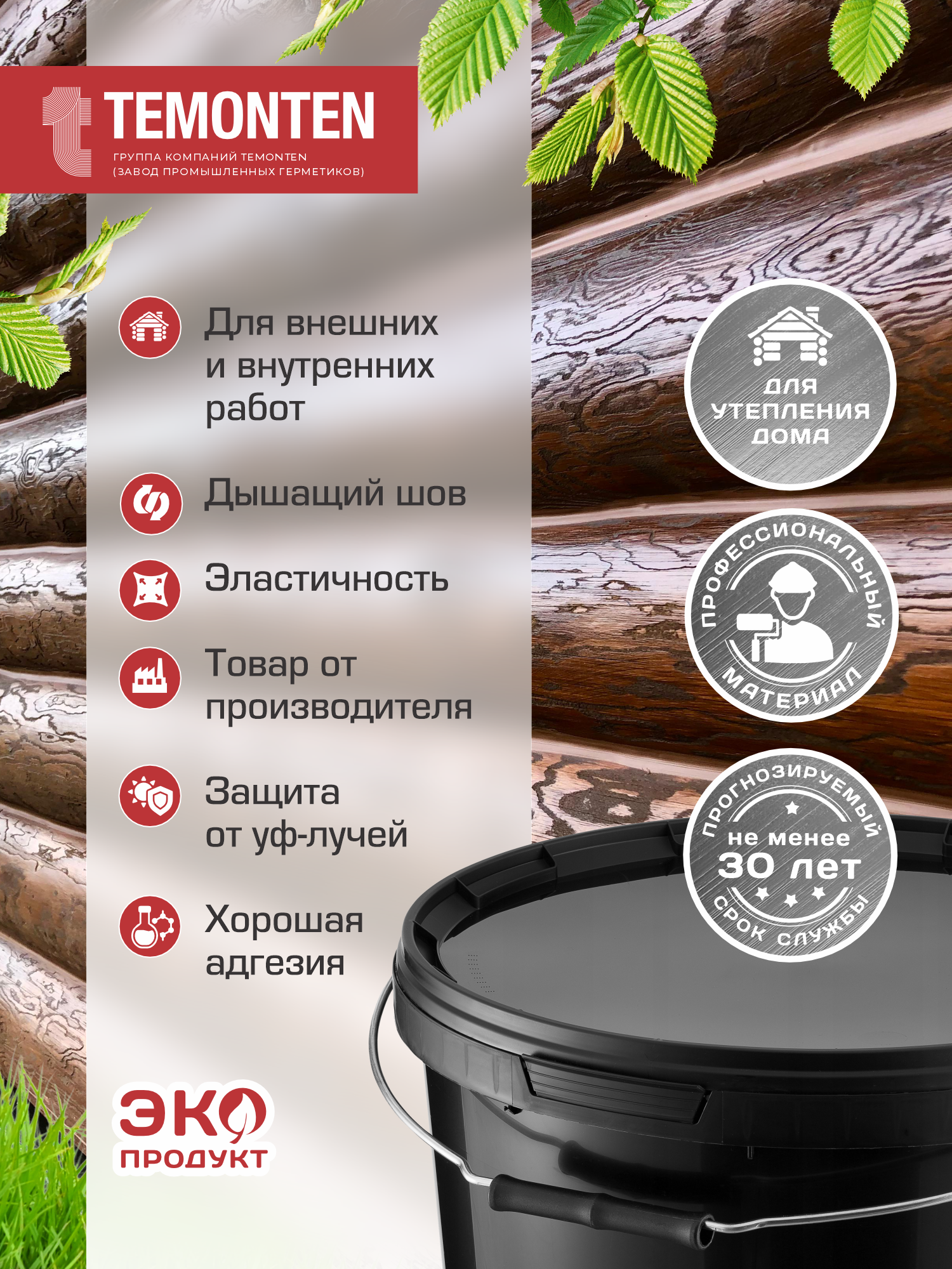 Бесцветный состав предотвращает растрескивание и гниение торцевых срезов бревен. Проникает на глубину до 3 см, создавая защитный барьер без изменения натуральной текстуры древесины.