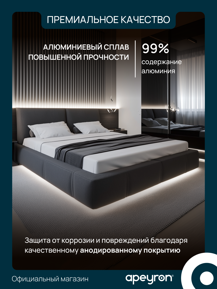 Функциональность: Алюминиевые профили 15.2х6мм для SMD-лент 3528/5050, система быстрого монтажа без пайки. Рассеиватель снижает контрастность световых точек на 60% по сравнению с открытыми лентами.