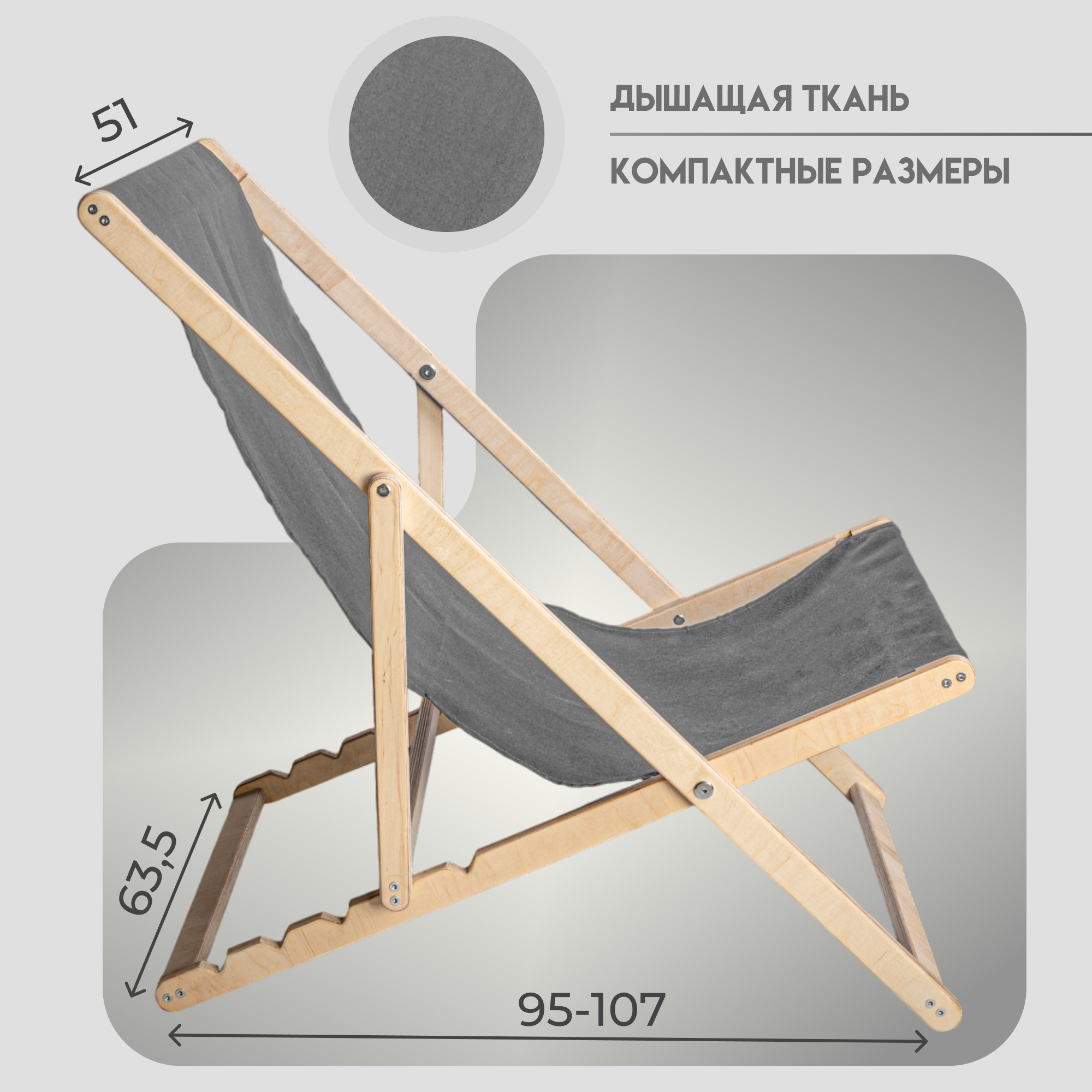 Каркас для шезлонга – антикоррозийная сталь с пределом нагрузки 110 кг. Регулировка спинки в 5 положениях. Время сборки – 2 минуты, вес – 3.8 кг. Совместим с большинством пляжных подушек до 70x200 см.