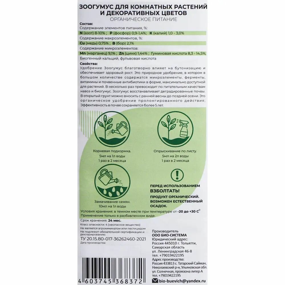 | Зоогумус для комнатных растений | 1 л | Биологическое восстановление почвы |