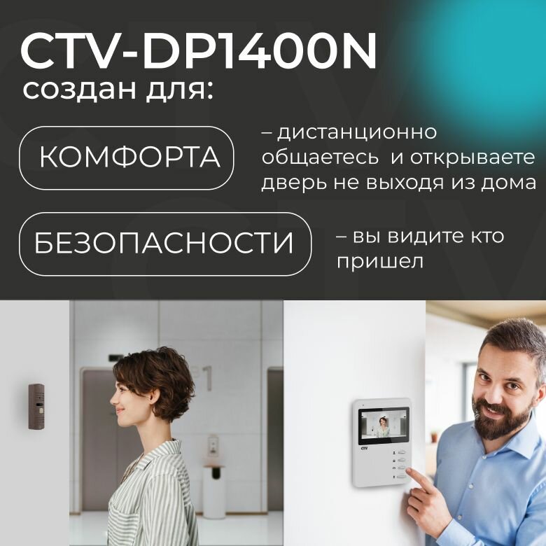 Комплекты видеодомофонов CTV-DP1400N задают новый стандарт безопасности с TFT дисплеем 4.3" и углом обзора 80°. Разнообразие цветовых решений (белый/бронза, черный/серебро, белый/серебро) позволяет интегрировать устройства в любой интерьер. Модели CTV-M2702MD и CTV-M4705AHD выделяются функцией записи видео, сохраняя данные о всех посетителях. Для облачных решений оптимален CTV KIT Cloud 7 с Wi-Fi модулем - он транслирует изображение на смартфон даже в ваше отсутствие.