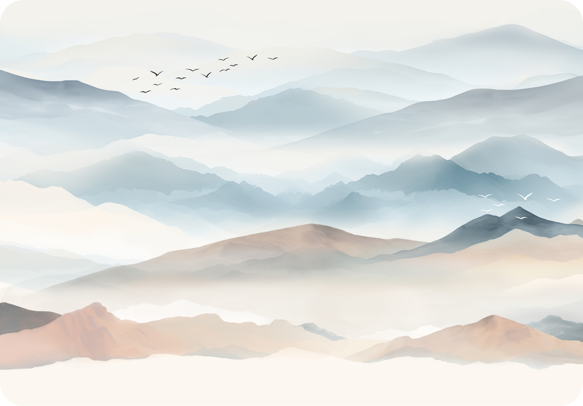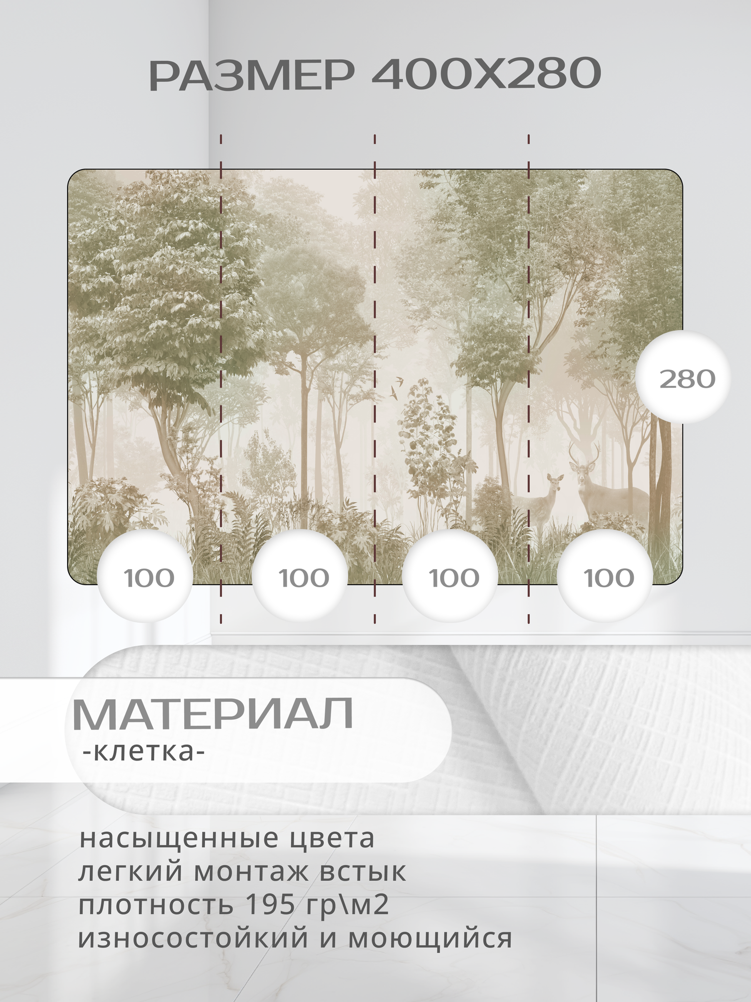 Модель "Горы в тумане" 400х270 см использует технику сфумато для плавных переходов, а "Силуэты гор" в фисташковых тонах — пример минималистичного дизайна. Для создания эффекта "бесконечного леса" разработана уникальная раскладка "Роща" 600х270 см.