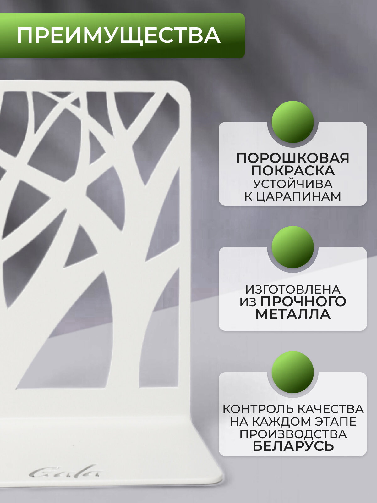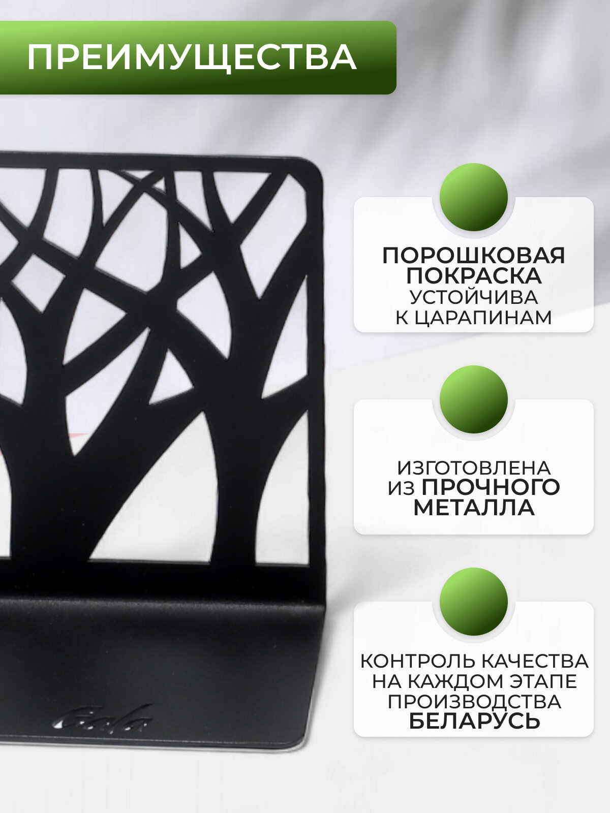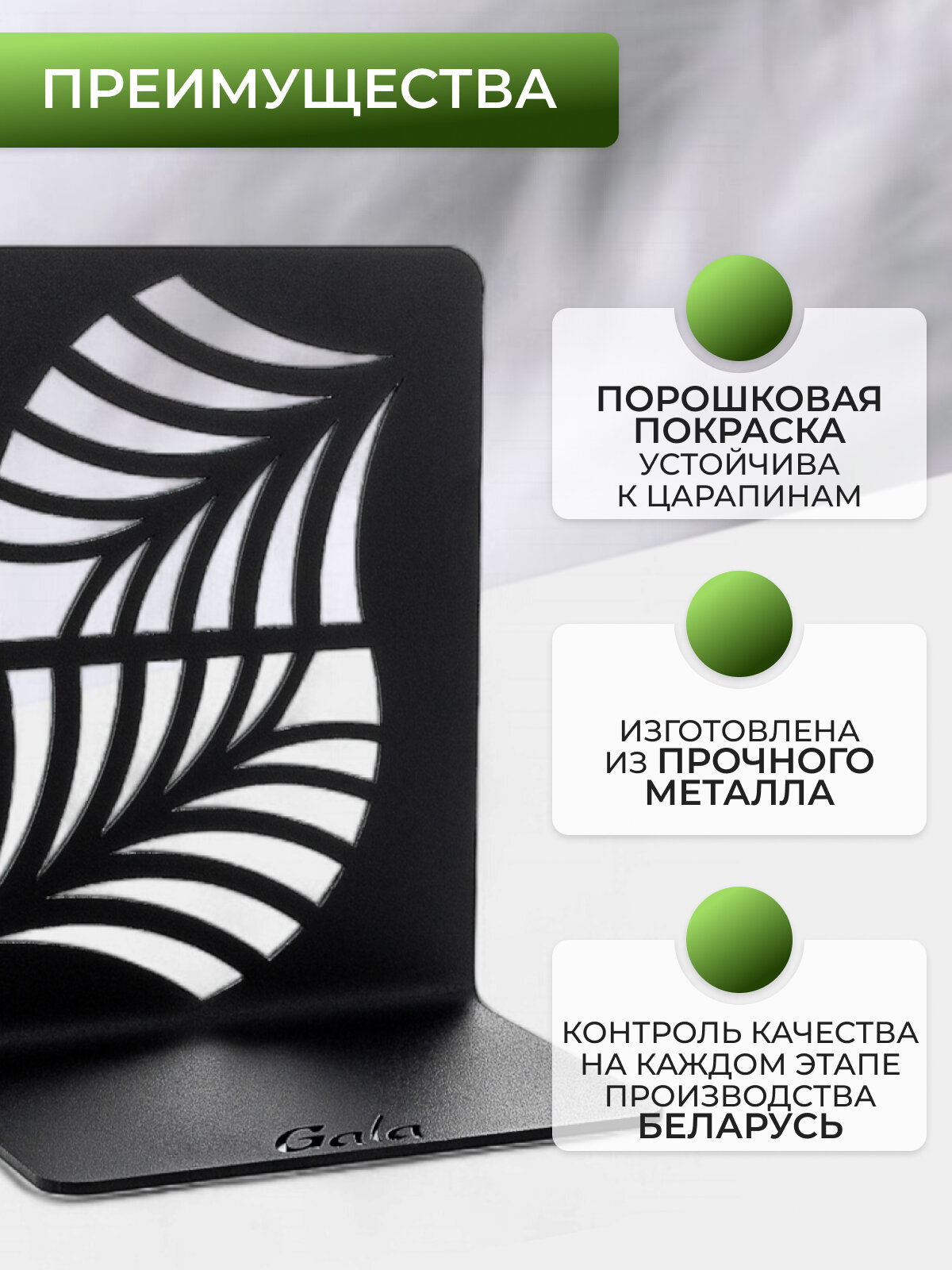 Черные кормушки KO001-BY и KO002-BY из влагостойкого металла созданы для дач и приусадебных участков. Габариты 48x22x110 см позволяют размещать их на деревьях или стенах беседок. Ограничители книг Gala (OK005-BY «Пальмовый лист») не только фиксируют издания, но и служат самостоятельным декором кабинета.