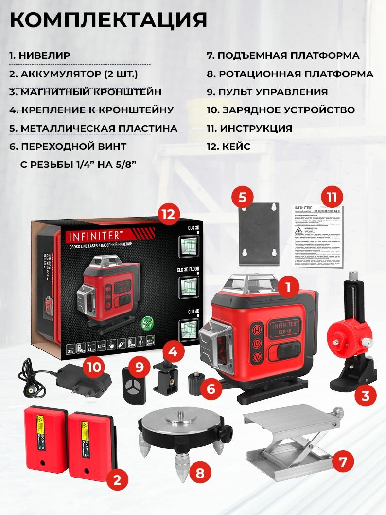 В каталоге товаров бренда Infiniter до конца ноября 2025 действует скидка на следующие товары: Лазерный дальномер INFINITER 30 1 2 325 Лазерный нивелир Condtrol Infiniter CL5 1 2 212 Дальномер лазерный Infiniter 100 1 2 324 Лазерный нивелир Infiniter CLG 3D new Лазерный уровень нивелир INFINITER CLG 3D с дальностью до 30 м зеленый луч Лазерный нивелир INFINITER CLG 4D уровень строительный зеленый дальность 60м чёрный матовый Лазерный нивелир INFINITER X360
