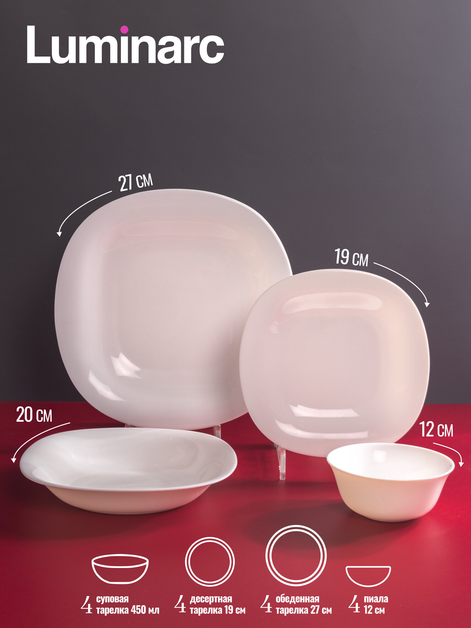 В каталоге товаров бренда Luminarc до конца декабря 2025 действует скидка на следующие товары: Набор блюд для сервировки LUMINARC FRIENDS TIME 3 шт 17см 21см 25см Набор тарелок Luminarc Идиллия стекло 18 предметов синий Стакан Luminarc Шетланд Скульптура объем 300 мл цвет синий стекло Luminarc Набор посуды столовой 16 предметов на 4 персоны DIWALI BLANC белый Кружка для чая и кофе Luminarc С добрым утром 320 мл стекло Набор столовой посуды Luminarc DIWALI WHITE 18 предметов белый цвет Набор салатников стеклянных Luminarc CANNES 12 см 6 штук 300 мл
