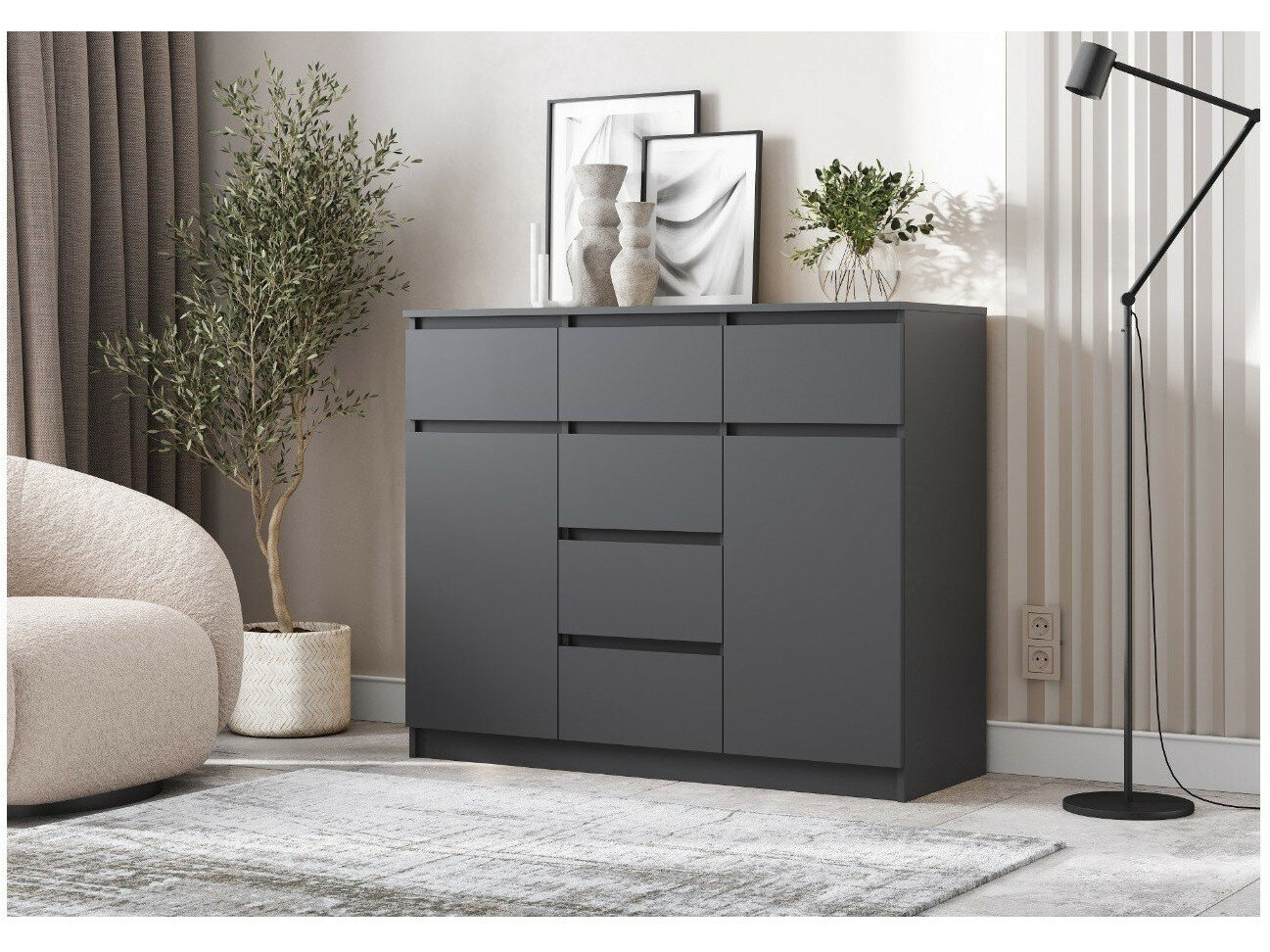 Линейка комодов МДМ с ящиками включает модели на 5-7 секций шириной от 1200 до 2400 мм. Серия "Композиция" с глянцевыми фасадами графитового цвета подходит для минималистичных интерьеров. Характеристики тумб: