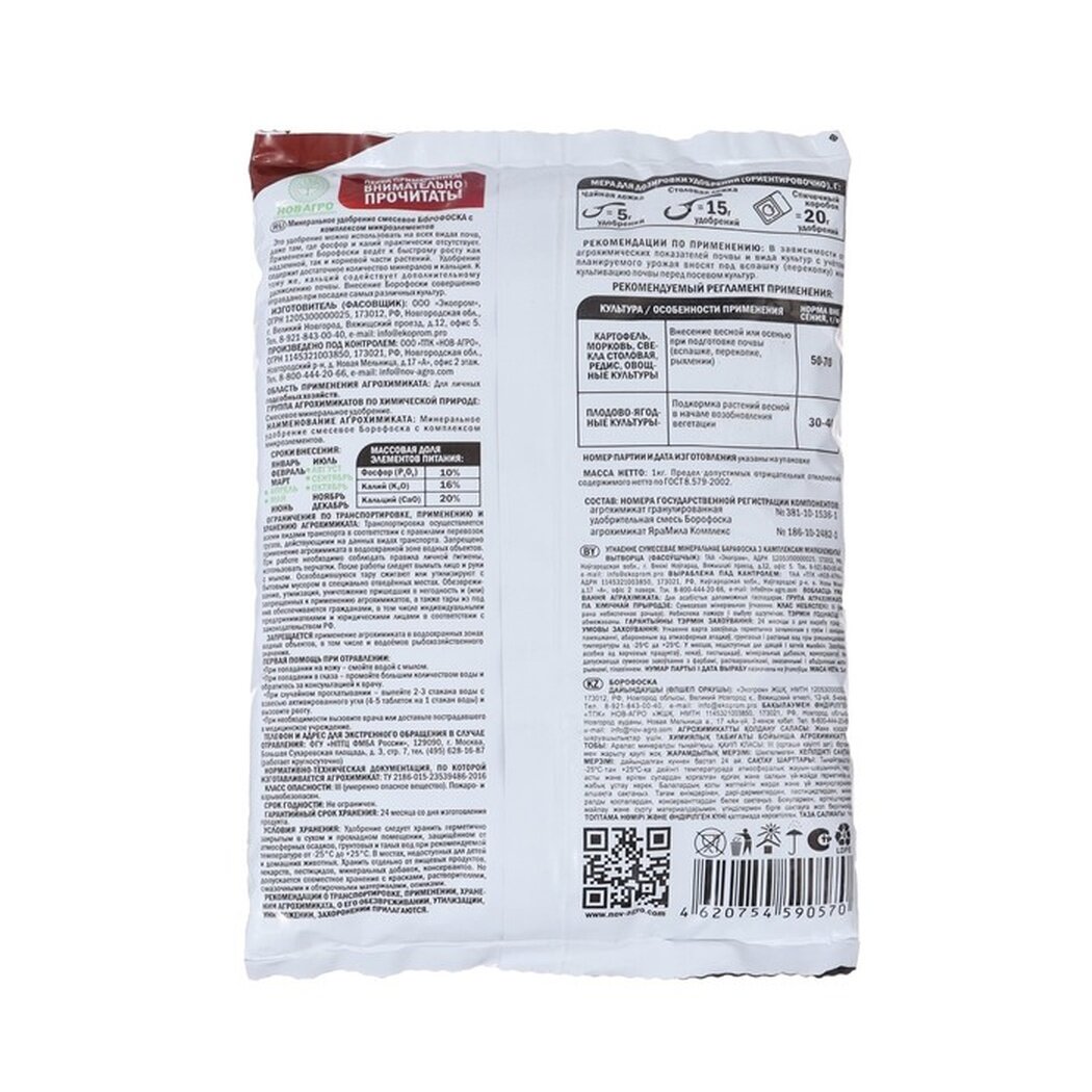 Комплексные составы Нов-Агро решают 97% задач подкормки растений за счет сбалансированных пропорций азота (N), фосфора (P) и калия (K). Азофоска 3 кг (NPK 16:16:16) подходит для стартового весеннего внесения под овощи, ягодные кустарники и газоны. Гранулы с центиметровым радиусом растворения создают питательную среду для корневых систем.