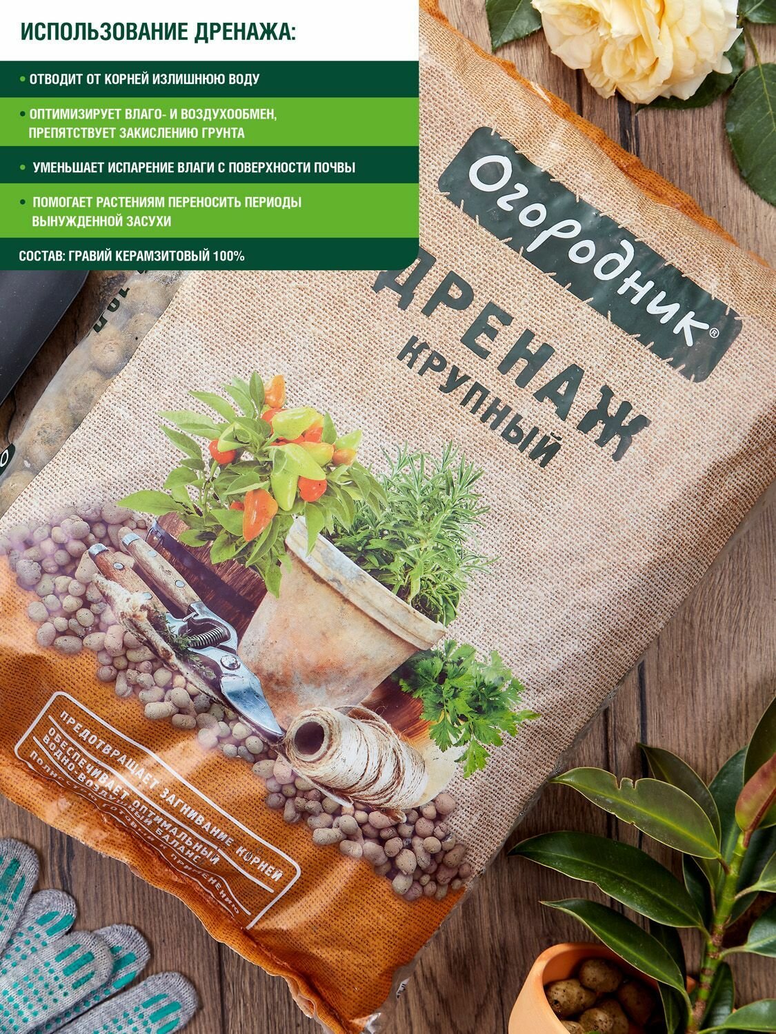 Грунт Садовая земля 60 л подходит для грядок и теплиц, а универсальный субстрат 40 л адресован комнатным растениям. Керамзитовый дренаж (фракция 2-3 см) предотвращает застой воды.