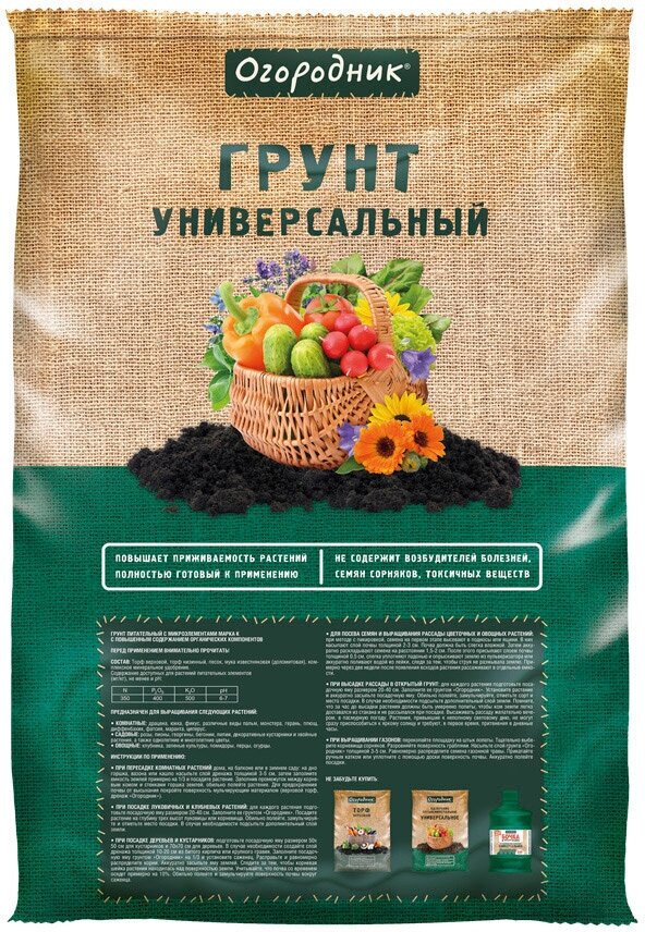 | Универсальный | 6.0-7.0 | Овощи, цветы, рассада |