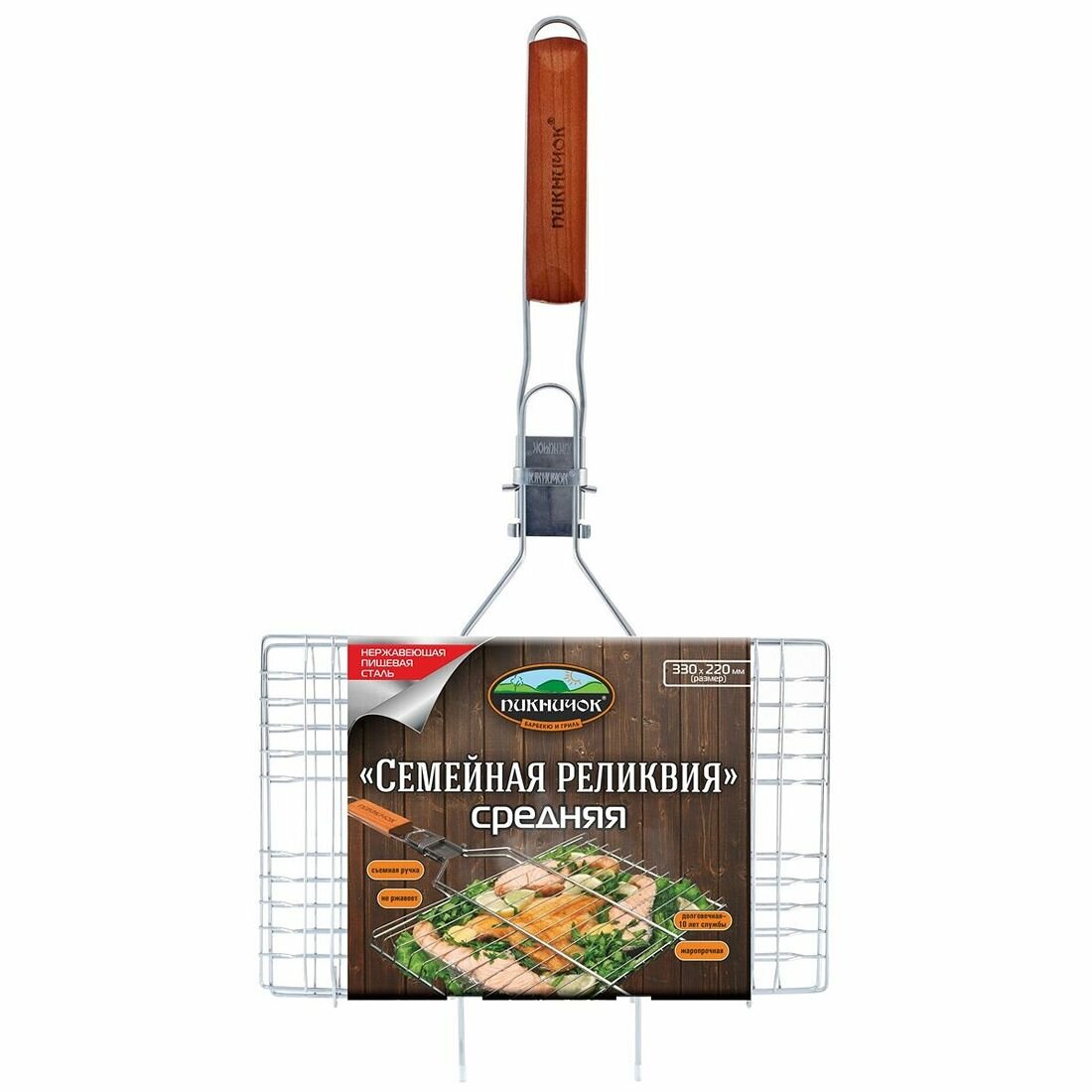 Изготовленные из углеродистой стали изделия выдерживают температуру до 400°С. Перекрестное плетение прутьев исключает прилипание продуктов. При выборе учитывайте тип готовки — для барбекю предпочтительнее глубокая решетка, а для быстрого обжаривания — плоская версия.