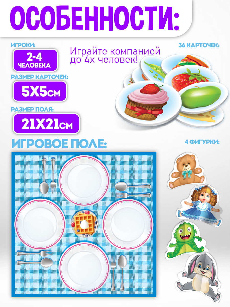 Настольная игра «Пикничок» с объемными фигурками развивает мелкую моторику у детей 3-6 лет. В комплекте: игровое поле, 8 персонажей и карточки с заданиями. Безопасные материалы и скругленные углы соответствуют требованиям ГОСТ для детских товаров.
