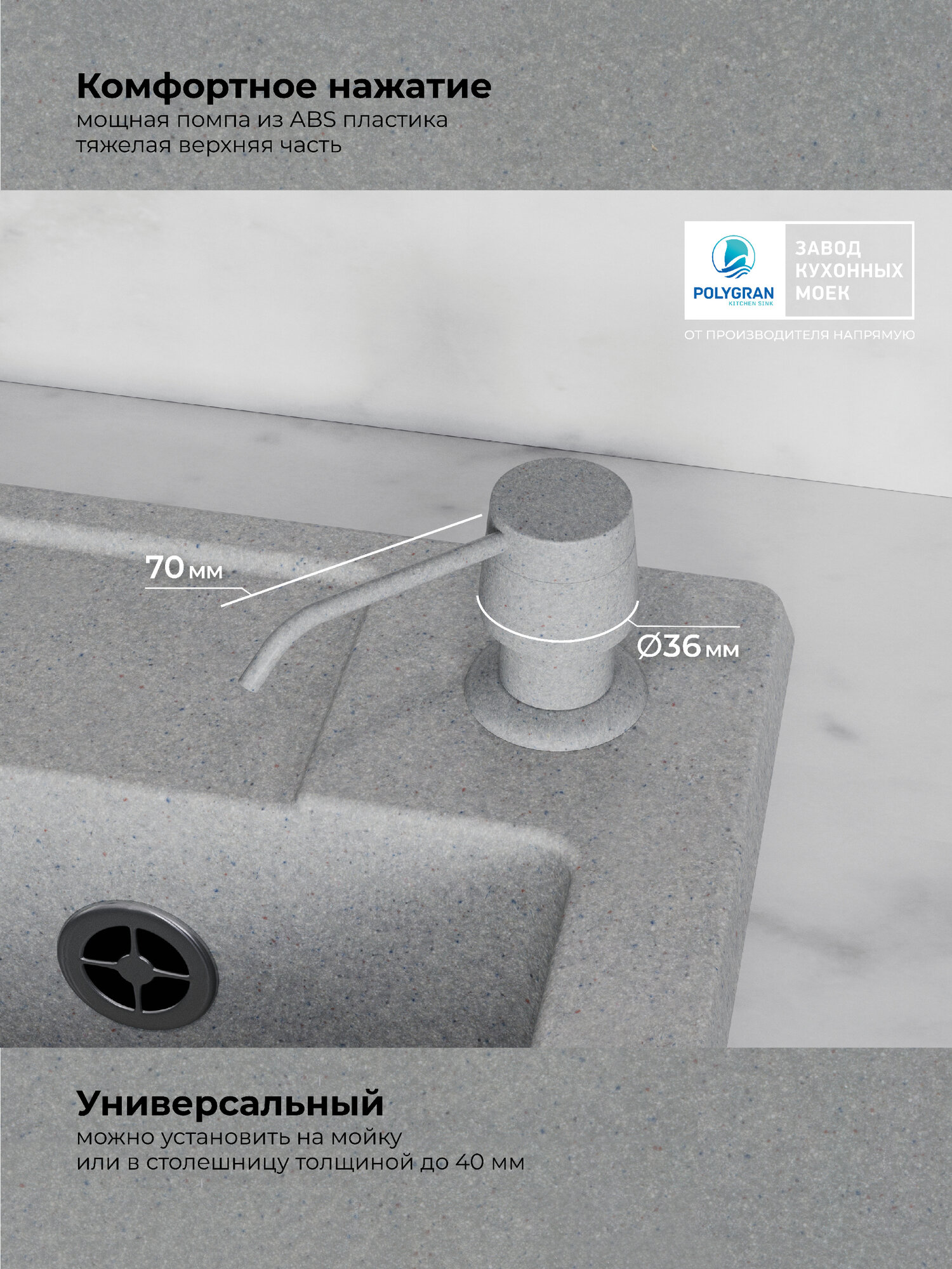Бренд Polygran специализируется на производстве кухонной сантехники и функциональных аксессуаров, объединяя инновационные технологии с продуманным дизайном. Продукция компании отвечает трем ключевым критериям: эргономичность, износостойкость и визуальная гармония. Каждый элемент систематизирован по сериям, что упрощает подбор комплектующих в единой стилистике.