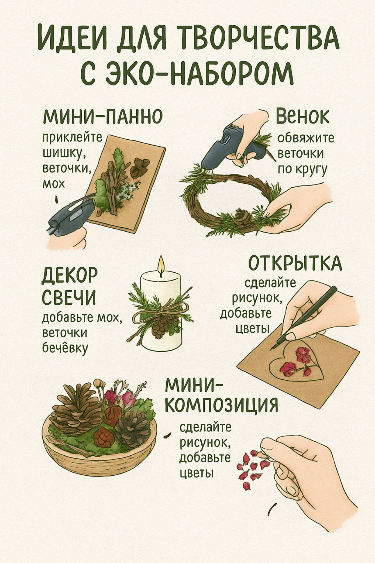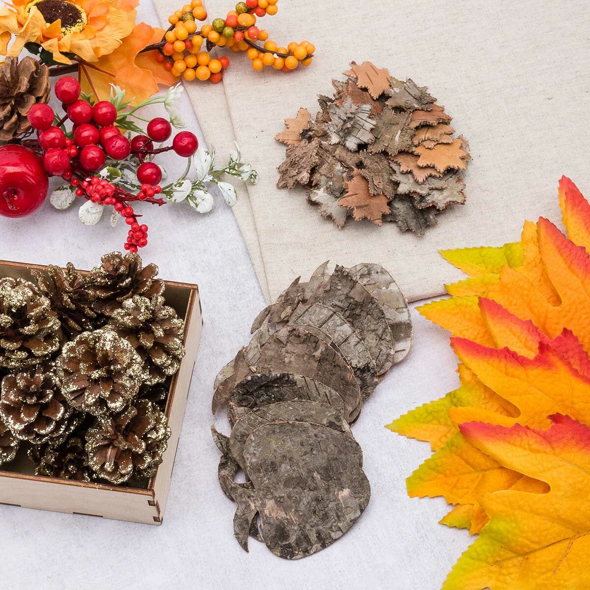 Набор Айрис "Природные материалы" (241 элемент за 680 ₽) включает 7 типов шишек, коры и спилов, подходящих для детского творчества и создания интерьерных панно.