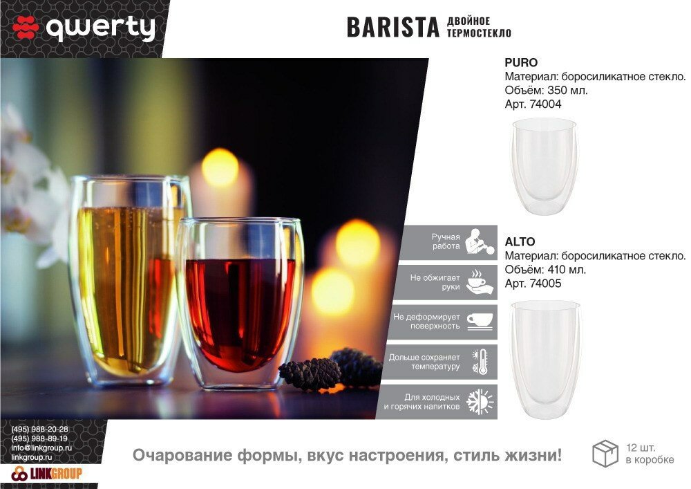 Линейка посуды с двойными стеклянными стенками — технологическая гордость бренда. Колбы из боросиликатного стекла толщиной 3 мм защищают от перепадов температур, сохраняя напитки горячими на 40% дольше стандартных аналогов.