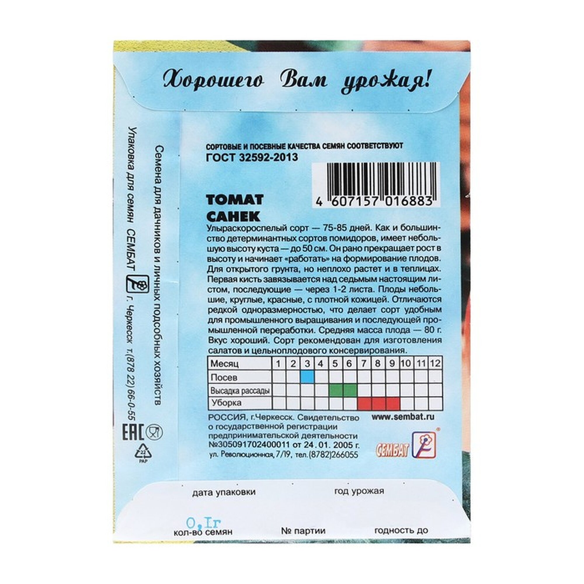 Линейка томатов Сембат включает как детерминантные сорта для открытого грунта (например, "Сибирский Скороспелый" высотой 40-50 см), так и высокорослые виды для теплиц ("Розовый Титан"). Сорт "Хурма" примечателен оранжевыми плодами с повышенным содержанием бета-каротина, а "Бычье сердце розовое" подходит для консервации благодаря мясистой структуре. Упаковки весом 0.1-1 г рассчитаны на 10-50 растений.