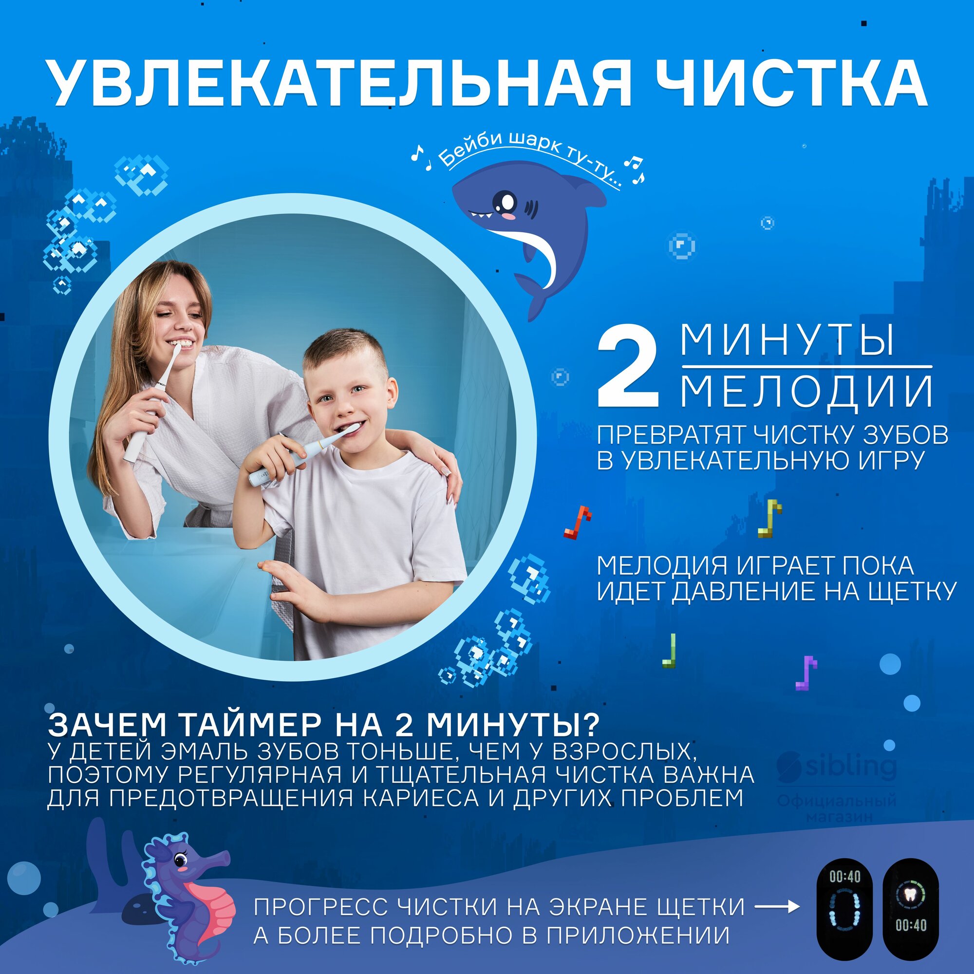Sibling предлагает ультразвуковые щетки для взрослых и детей с датчиком давления на эмаль. Модели Powerbrush-FW (белая) и Powerbrush-FB (черная) для взрослых оснащены 6 режимами очистки — от деликатного отбеливания до массажа десен. Детские версии Powerbrush-QP в голубом и розовом цветах имеют встроенные таймеры с игровыми уведомлениями и 2 сменные насадки с мягкой щетиной. Все щетки синхронизируются с приложением, формируя персонализированные отчеты о качестве чистки.