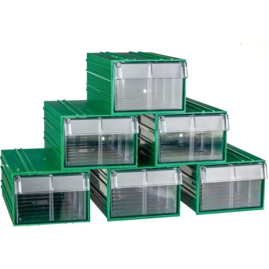 Комплекты ящиков (К6, К9, К3) снижают затраты на логистику и обеспечивают единый стандарт хранения. Прозрачные или цветные стенки (синий, зеленый, серый, желтый, красный) упрощают визуальную идентификацию содержимого. Система V-серии предусматривает совместимость с разделителями типа Р-V-4 и перегородками С2-К10, что позволяет создавать гибкие схемы сортировки мелких деталей, инструментов или комплектующих.