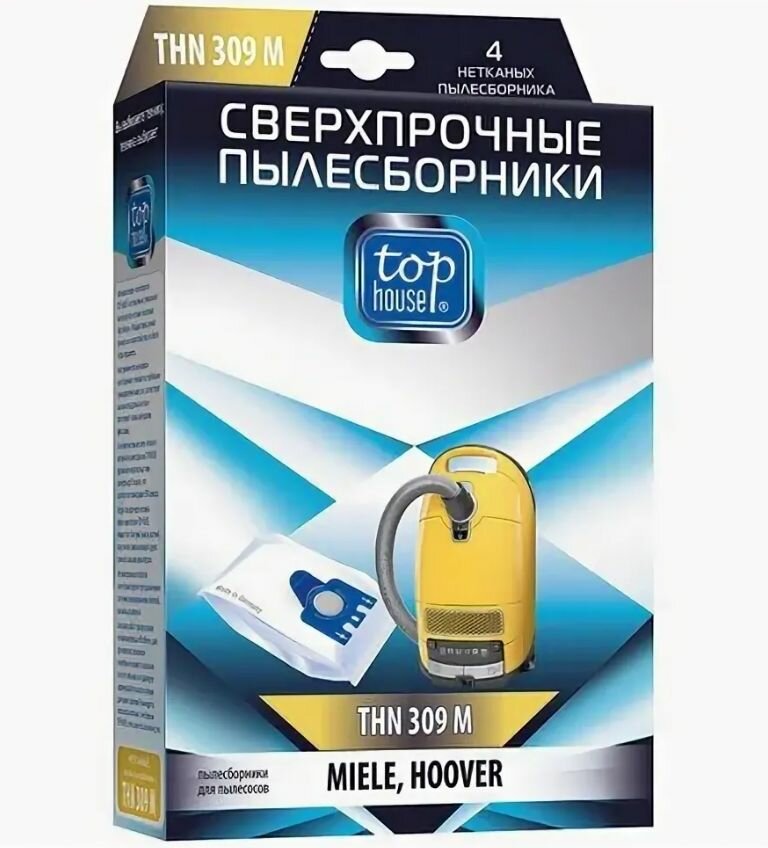 Для владельцев пылесосов Miele предлагаются пылесборники TOP HOUSE THN 309 M из нетканого полотна. Усиленные швы выдерживают давление 5 бар, что предотвращает разрывы при сборке строительной пыли. Комплект из 4 штук рассчитан на 3 месяца регулярного использования.
