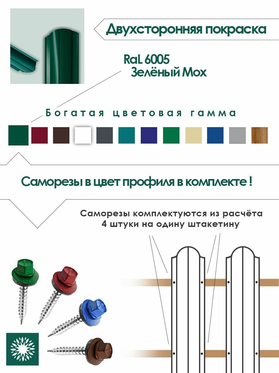 Металлический штакетник RAL 6005 с двухсторонним полимерным покрытием обеспечивает 15 лет антикоррозийной защиты. Особенности упаковки по 10 планок упрощают логистику и монтаж.