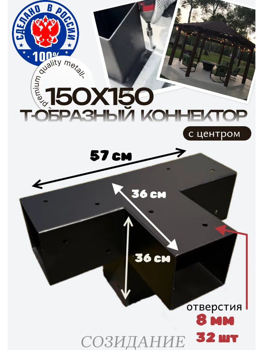 Для создания архитектурных форм бренд предлагает Т-образные коннекторы с центром под брус 150х150 мм. Применение в строительстве пергол и беседок обеспечивает: