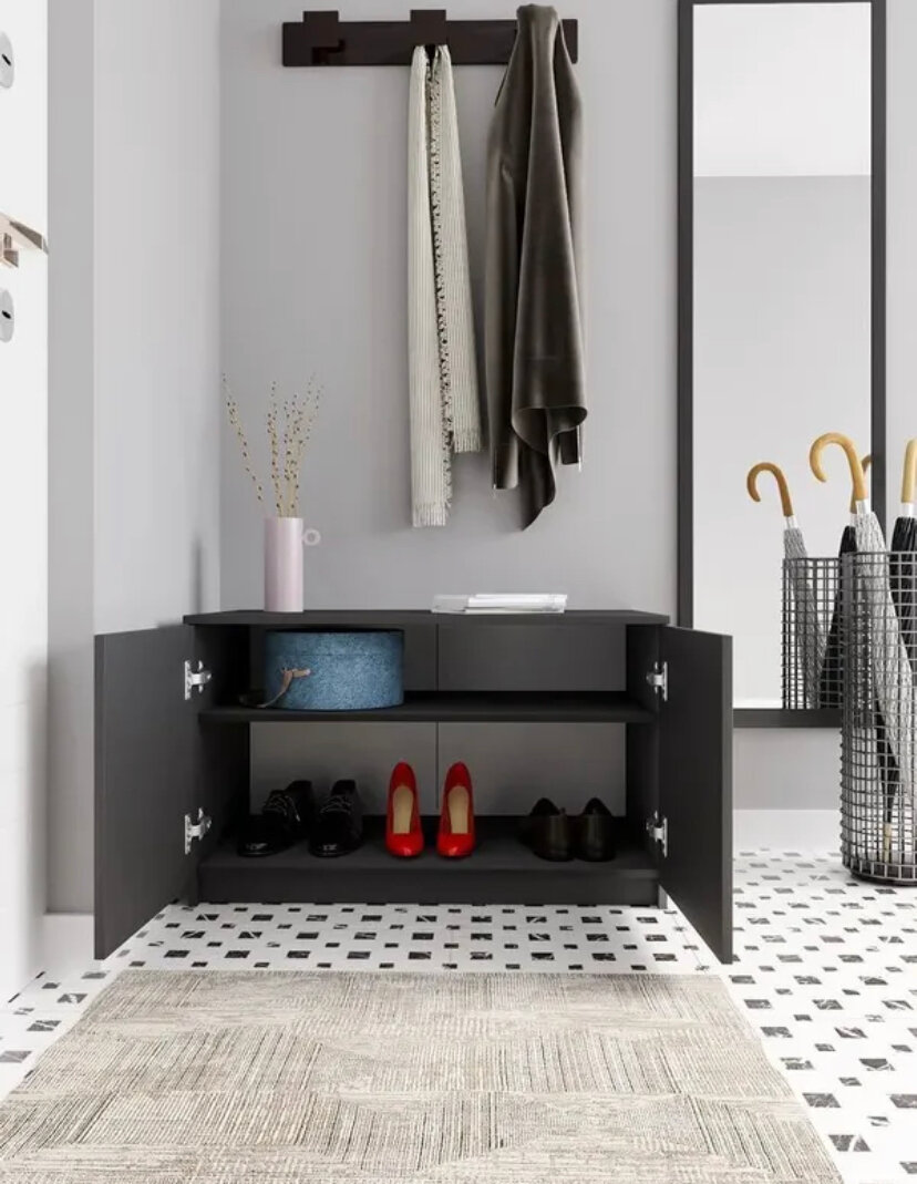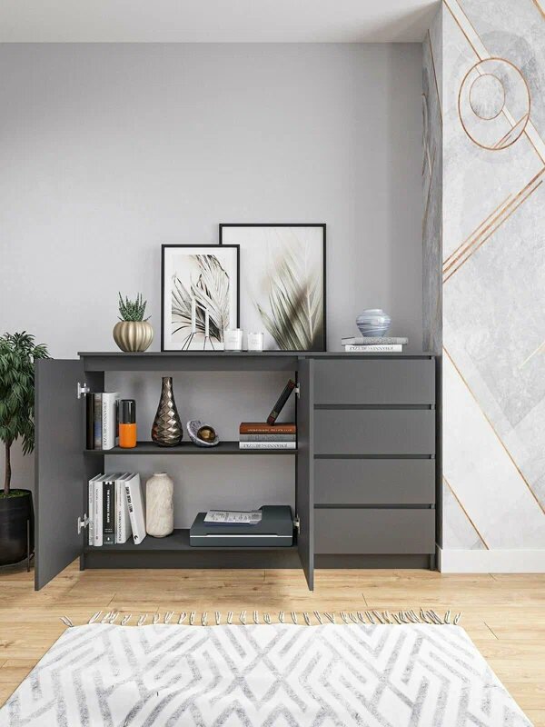 Комод-трансформер Эверест-4 (140×90×40 см) с четырьмя дверцами заменяет платяной шкаф в малогабаритных студиях. Филенчатые фасады шкафа Мори-7 (190×250×60 см) создают эффект классической мебели. Модель графит 160x49x210 см с зеркальными вставками оптически расширяет пространство.