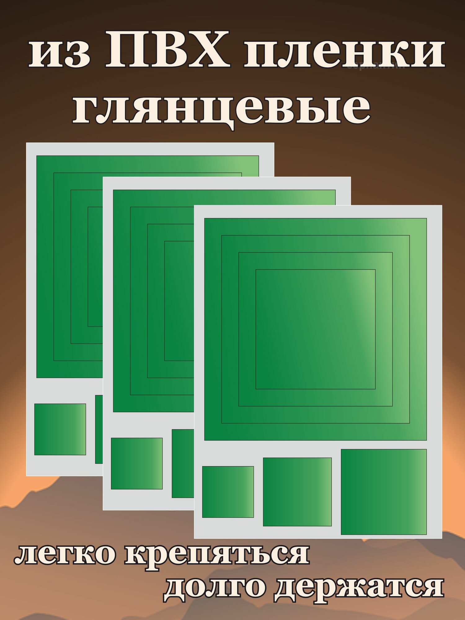 | Наклейки-квадраты (зелёные, с контуром) | Виниловые стикеры для декора мебели, ноутбуков, авто. Влагостойкие, не оставляют следов. |